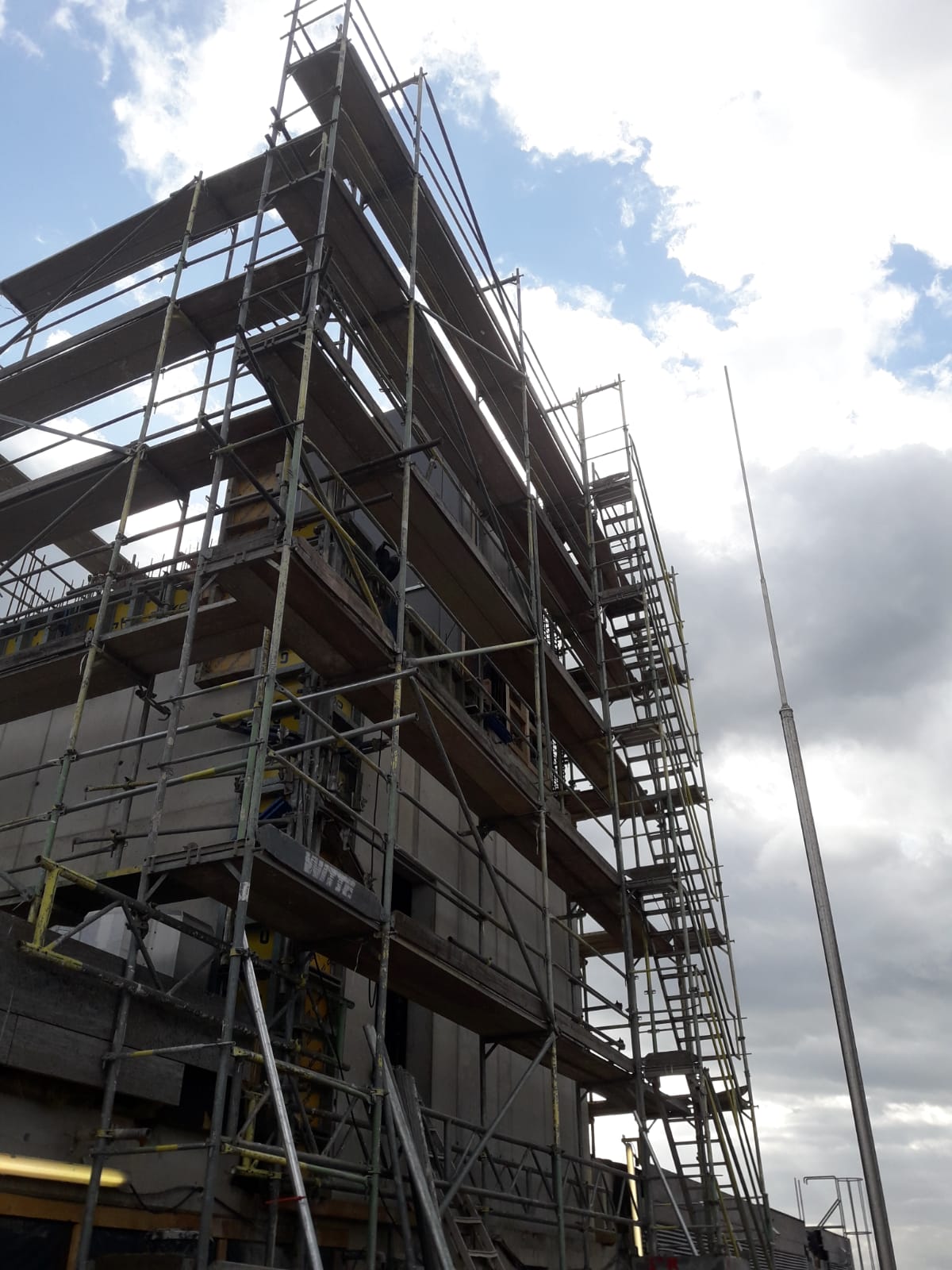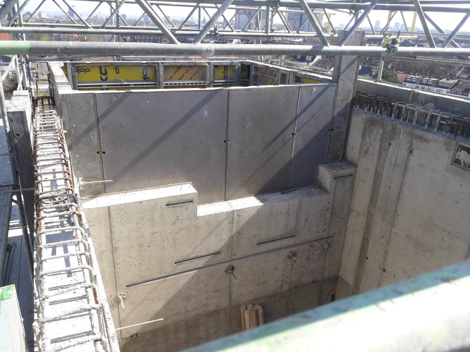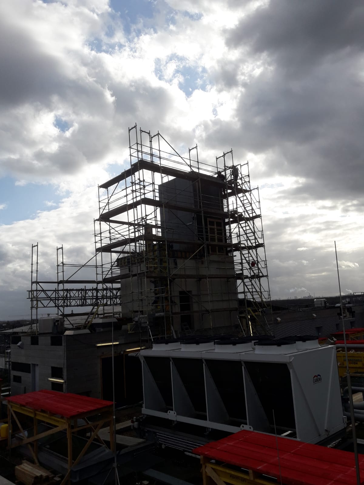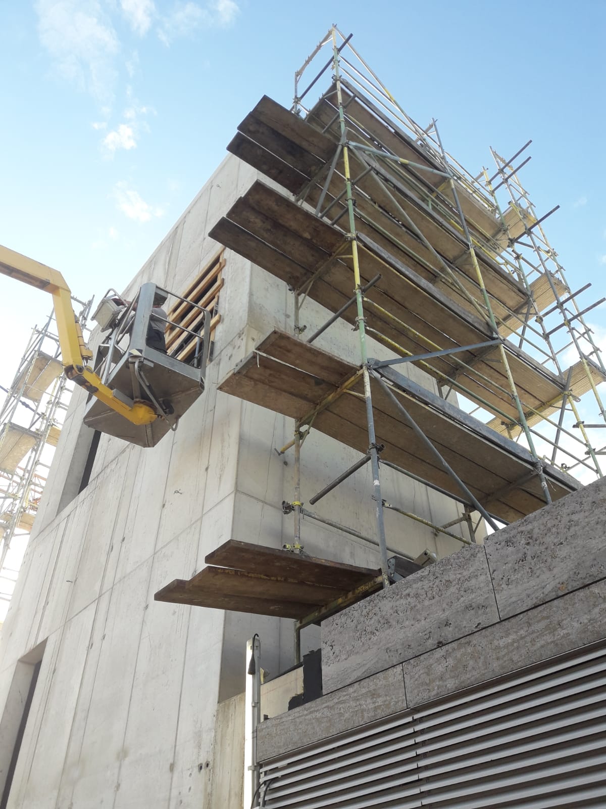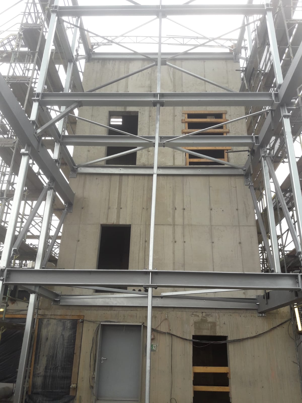 Umfangreiche Gerüstarbeiten einschließlich Wetterschutzdach. Stellung eines Baukranes mit 70 Meter Ausladung für die gesamte Bauausführung. Umfangreiche Arbeiten als Nachunternehmer für den Verguss der Stahlkonstruktionen der Plattform. Alles im laufenden Betrieb.